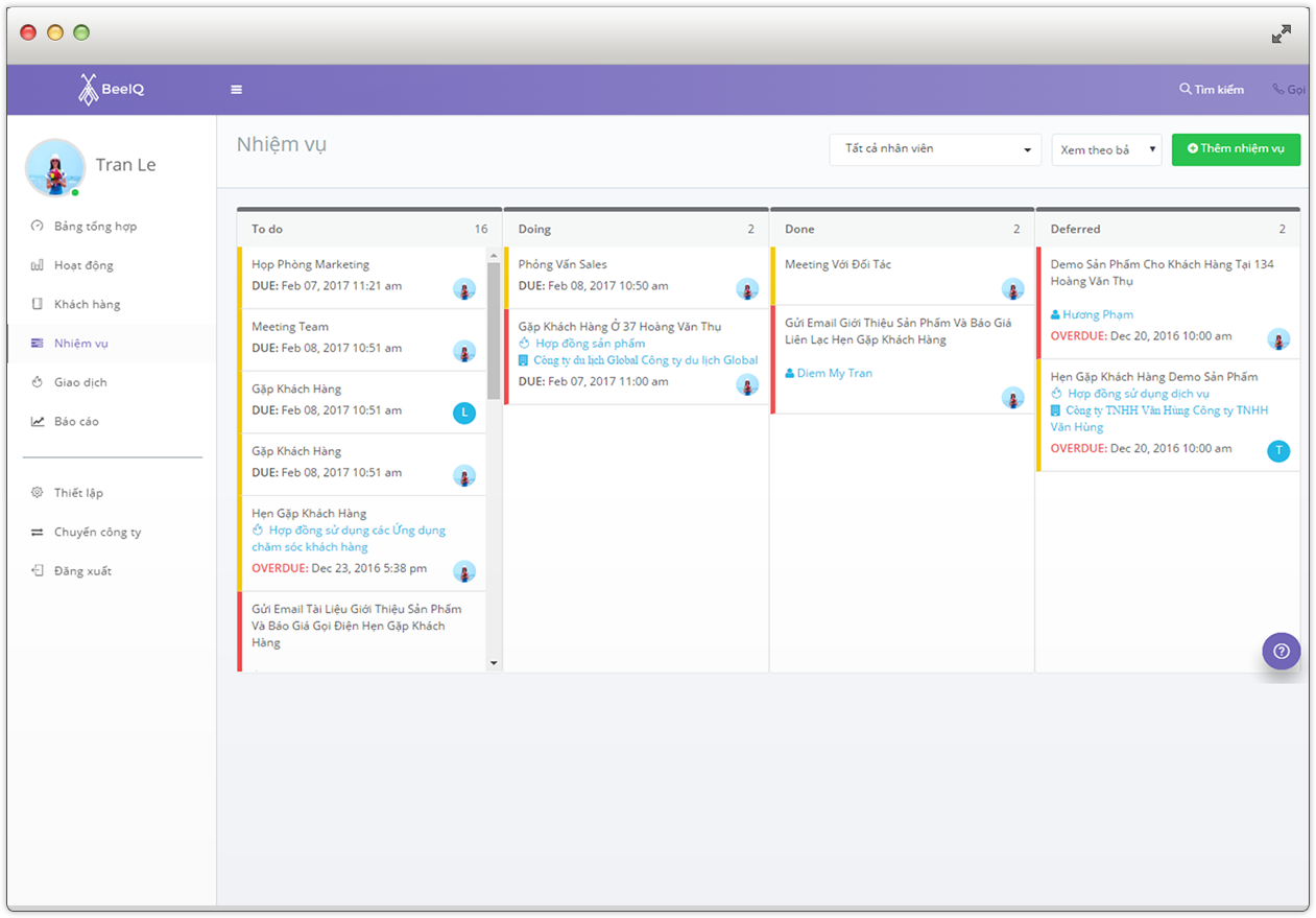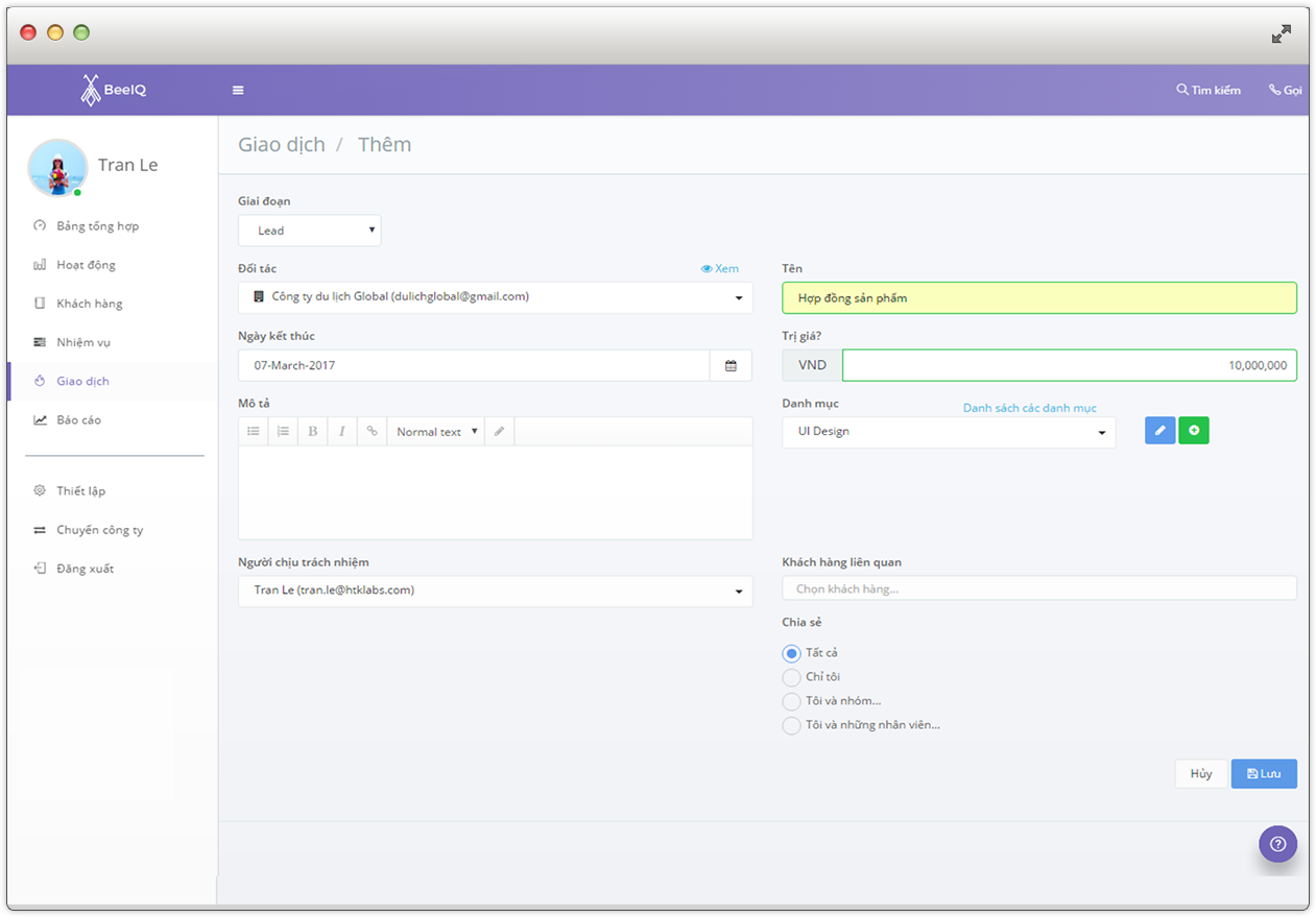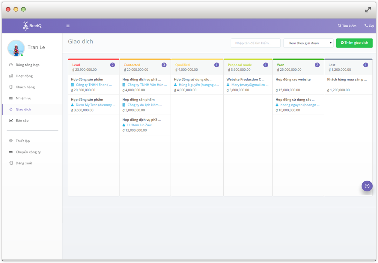 - Giao dịch giúp bạn quản lý lịch sử và theo dõi được trạng thái của từng hợp đồng, giúp bạn đưa ra các quyết định phù hợp để tăng cường khả năng làm việc của nhân viên cũng như đưa ra các hoạch định kinh doanh và chiến lược chăm sóc khách hàng hiệu quả.