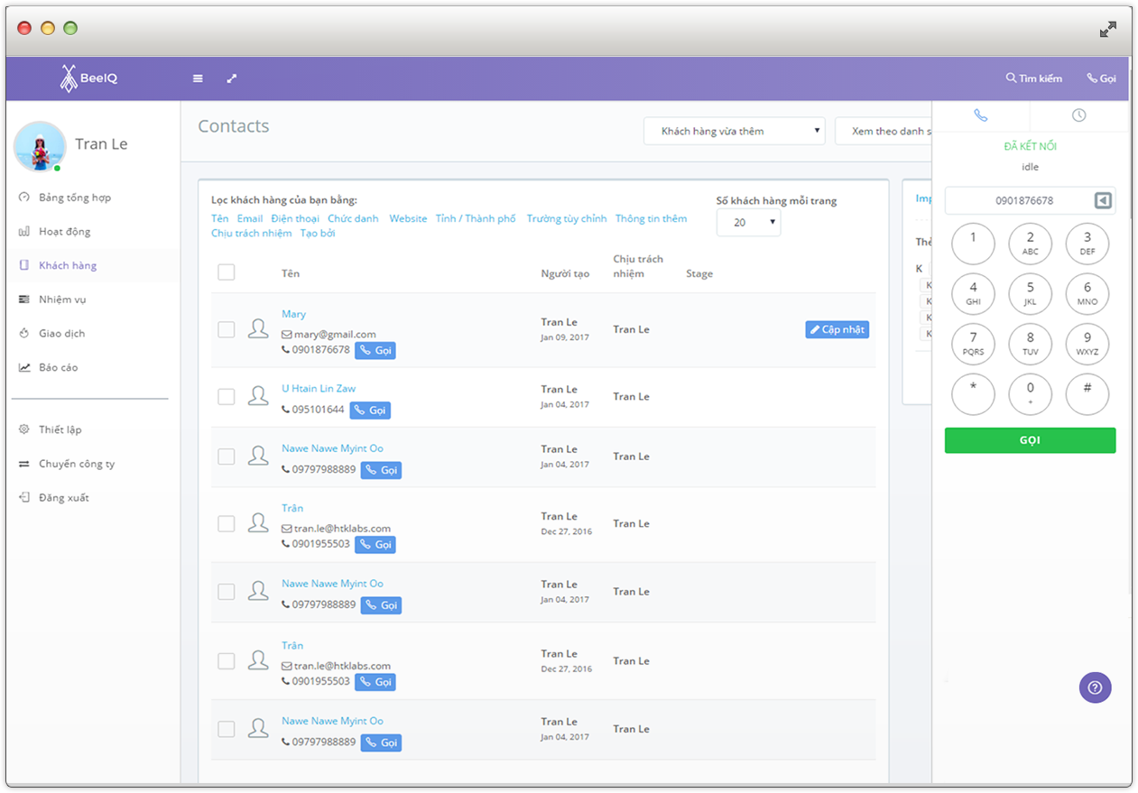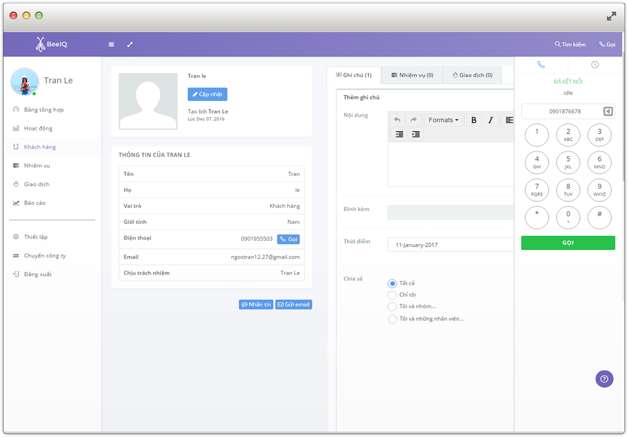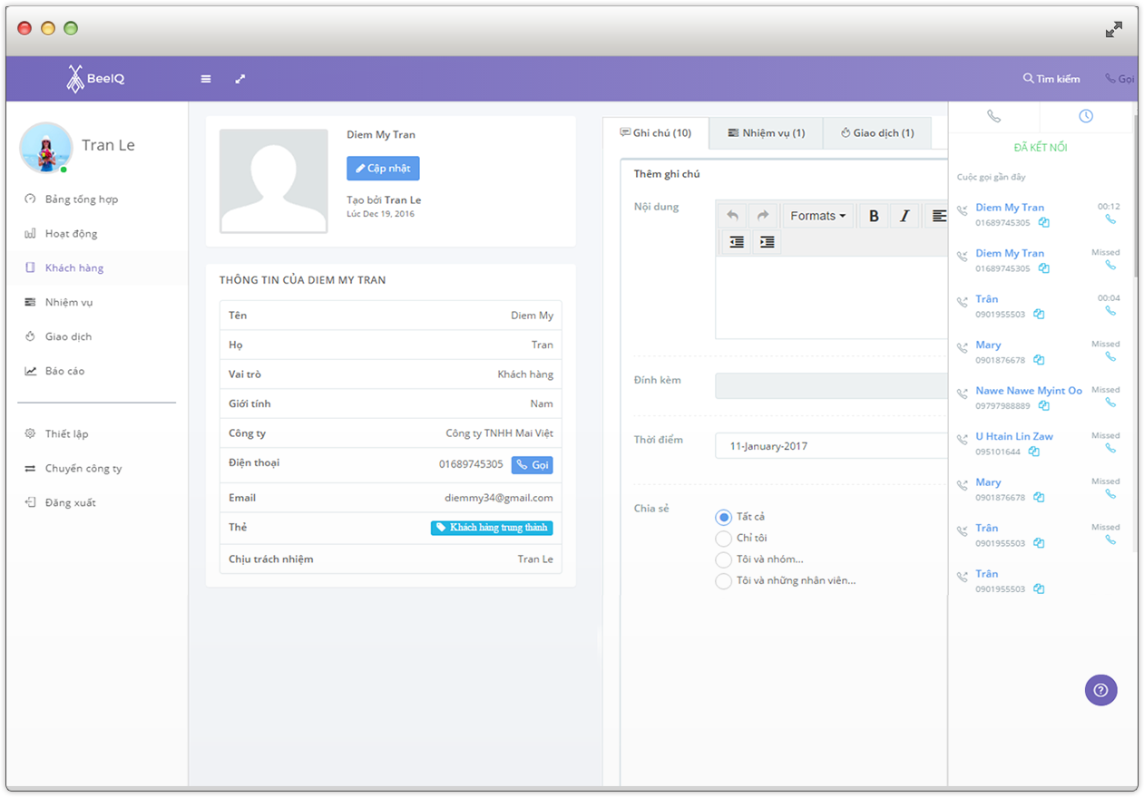 - Lưu toàn bộ lịch sử cuộc gọi, đoạn hội thoại và đoạn chat từ Phone, Web, Facebook, Skype cùng các giao dịch về tại phần mềm BeeIQ.